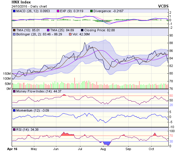 HNX-Index kết phiên với cây nến đỏ dài cho thấy áp lực bán mạnh trong phiên và tâm lý tiêu cực của nhà đầu tư. Chỉ số đóng cửa ở dưới đường MA5 (84,5 điểm) và MA10 (84,8 điểm) nên tín hiệu trong ngắn hạn chuyển từ trung tính về tiêu cực, với ngưỡng kháng cự gần nhất là 82,25 điểm (đáy phiên 20/9). Chỉ số đóng cửa ở dưới đường MA20 (84,9 điểm) và MA50 (84,1 điểm) nên xu hướng trong trung hạn là tiêu cực. Dự báo xu hướng của HNX-Index trong phiên 25/10 có thể là lui về kiểm tra lại mốc hỗ trợ tại 82,25 điểm. Nếu ngưỡng hỗ trợ giữ vững, chỉ số sẽ dao động trong khoảng 82,3-84 điểm.