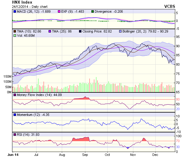 Đồ thị chỉ số HNX-Index vẫn chưa vượt được ngưỡng 83 điểm. Nếu tiếp tục dao động quanh vùng này quá lâu, chỉ số này nhiều khả năng sẽ quay lại xu hướng điều chỉnh. Các chỉ báo kỹ thuật tiếp tục cho tín hiệu tích cực trong phiên 24/12.