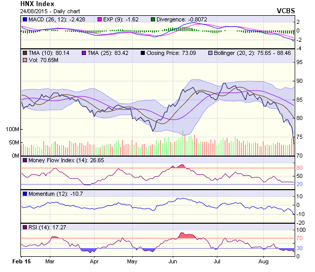 Đồ thị HNX-Index cũng đã phá đáy cũ tháng 5/2015 tương đương vùng 76,5 – 77,5 điểm. Chỉ số này sẽ hướng tới mốc 70 điểm là vùng đáy được thiết lập khi xuất hiện sự kiện Biển Đông trong thời điểm giữa tháng 5/2014. Các chỉ báo kỹ thuật vẫn trong trạng thái quá bán và chưa xuất hiện tín hiệu về khả năng hồi phục trong ngắn hạn.