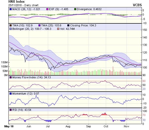 HNX-Index có diễn biến tương tự. Mặc dù, chỉ số có phiên giảm điểm nhưng vẫn duy trì đóng cửa trên MA5 và 20, cho thấy xu hướng phục hồi ngắn hạn có thể vẫn được duy trì, chỉ số có thể sớm quay trở lại tiến lên thử thách vùng kháng cự quanh 105.7 điểm (đỉnh tháng 11/2018).