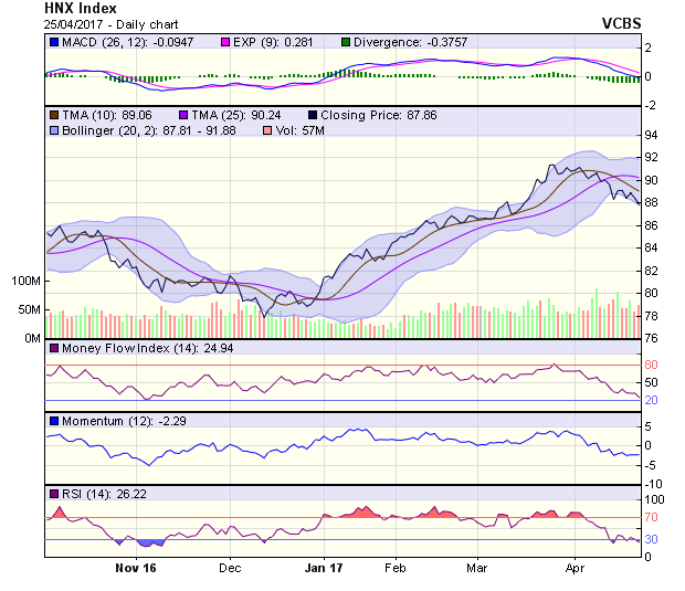 Về xu hướng dài hạn, HNX-Index tiếp tục trong thị trường giá lên (bull market), với hỗ trợ tại 84,2 điểm (MA200). Dự báo phiên 26/4, HNX-Index có thể tiếp tục giảm điểm để kiểm tra lại hỗ trợ gần nhất tại 87,5 điểm (đáy phiên 18/4) và kháng cự gần nhất tại 88,5 điểm (MA5-50).