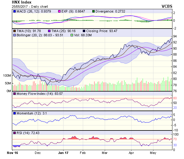 Dự báo phiên 26/5, HNX-Index nhiều khả năng tiếp tục tăng điểm để hướng tới mốc kháng cự tiếp theo tại 94 điểm, vùng hỗ trợ gần nhất tại 91,9-92,6 điểm.