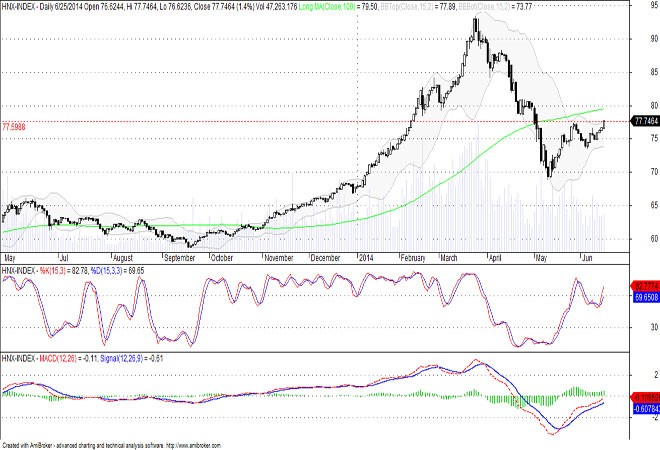 HNX-Index tăng mạnh, mức tăng này giúp đường giá tiếp cận vùng kháng cự quan trọng. Mức đóng cửa phiên 25/6 đã cao hơn MA trung hạn và nằm sát bên dưới kháng cự 78,2 điểm.