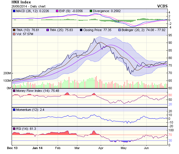 Với diễn biến trái ngược với HOSE, HNX-Index giảm nhẹ 0,4 điểm xuống 77,35 điểm. Đường giá không thể duy trì được đà tăng cho thấy xu thế giằng co trong vùng giá hẹp vẫn chiếm ưu thế trong ngắn hạn. Dải Bollinger chưa cho dấu hiệu cải thiện, kết hợp với DI hay RSI chưa cho tín hiệu mua - bán rõ ràng. Theo đó, trong các phiên tới chủ yếu HNX-Index sẽ tiếp tục dao động quanh khoảng 76 – 78 điểm với xu thế giằng co tiếp tục chiếm ưu thế.