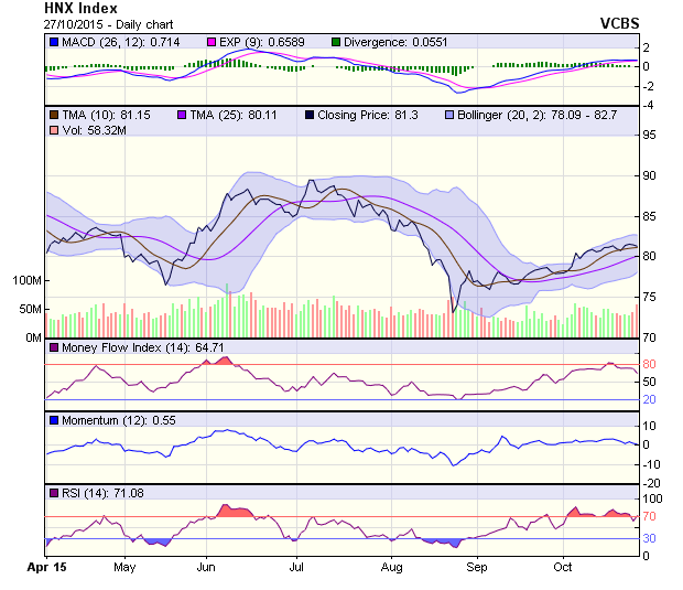 Đồ thị HNX-Index tạo thành Doji và hiện đang tiệm cận channel tăng điểm ngắn hạn. Nếu tiếp tục rơi xuống dưới channel này, xu hướng giảm điểm sẽ diễn ra mạnh mẽ. Các chỉ báo kỹ thuật không rõ ràng khi MACD đi ngang, trong khi Band%B tiếp tục suy yếu từ vùng quá bán.