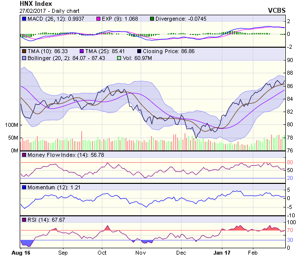 HNX-Index có phiên tăng điểm thứ 2 liên tiếp với diễn biến khá tích cực. Tín hiệu kỹ thuật ngắn hạn chuyển từ tiêu cực lên tích cực, với vùng hỗ trợ trong khoảng 86,3-86,6 điểm (MA5-10) và kháng cự gần nhất tại 87,3 điểm (đỉnh phiên 24/2). Tín hiệu kỹ thuật trung hạn duy trì tích cực, với hỗ trợ gần nhất tại 85,7 điểm (MA20).