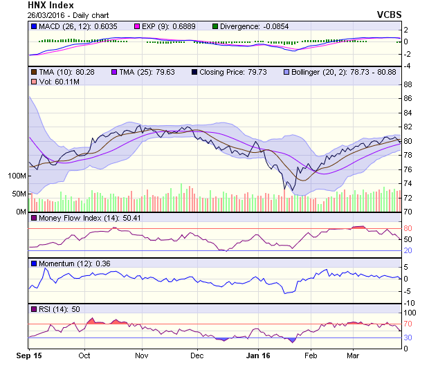 Sau nhiều tuần tích cực liên tục, HNX-Index chốt tuần giao dịch này giảm điểm so với phiên giao dịch đầu tuần. Thanh khoản cũng tăng cao so với các tuần trước đó. Chỉ số hiện tại đã rơi xuống dưới ngưỡng tâm lý 80 điểm. Tuy nhiên, đây vẫn chỉ là một tuần điều chỉnh ngắn hạn khi chỉ số tiếp cận vùng kháng cự mạnh ở 81-82 điểm. RSI và MACD vẫn tiếp tục cho tín hiệu đi lên, tuy nhiên Stochastic Oscillators hiện đang nằm trong vùng overbought, do vậy tín hiệu bán có thể xáy ra bất cứ lúc nào. Theo đó, chỉ số sẽ điều chỉnh tích lũy trong vùng 79,5-80,8 điểm trong tuần tới.