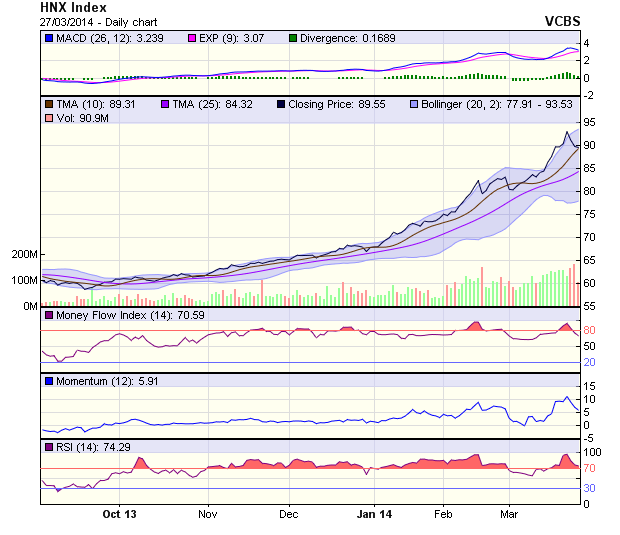 Trung hạn, HNX-Index vẫn đang trong xu hướng tăng điểm với độ dốc khá cao. Chỉ số RSI được giữ trong vùng quá mua với thời gian dài. Các dấu hiệu này cho thấy chỉ số có rủi ro điều chỉnh mạnh bất cứ khi nào.