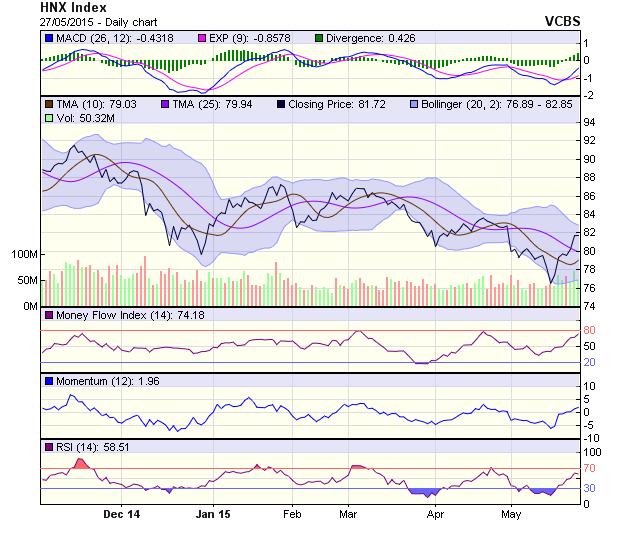 Đồ thị HNX-Index phản ứng khá tiêu cực với vùng cản 81.5 - 82 điểm và đường SMA50 khi tạo thành 1 Doji với thân nến ngắn và đuôi nến khá dài, cho thấy trạng thái tâm lý của nhà đầu tư khá giằng co.