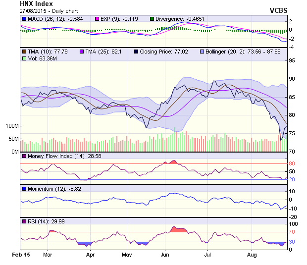 Sau 3 phiên tăng liên tiếp, đồ thị HNX-Index đã bứt phá thành công khỏi mốc kháng cực là vùng đáy 76,4 điểm được thiết lập giữa tháng 5/2015. Mốc kháng cự này sẽ trở thành mốc hỗ trợ cho chỉ số trong các phiên tới. Chỉ báo RSI tiếp tục cắt lên mạnh mẽ từ vùng quá bán. Đường Stochastic cũng đang cắt lên mạnh mẽ cho dấu hiệu về đà hồi phục tích cực của thị trường.