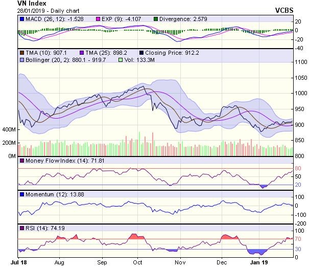 Dự báo, trong phiên giao dịch tiếp theo 29/1, VN-Index có thể sẽ tiếp tục giằng co và đi ngang với vùng kháng cự gần nhất trong khoảng 915-920 điểm (MA50), thanh khoản có thể vẫn sẽ thấp.
