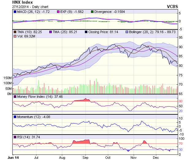 Về mặt kỹ thuật, HNX-Index tiếp tục xu hướng giảm về vùng hỗ trợ 80 điểm, trong khi VN-Index chững lại đà giảm, với diễn biến này thì cả 2 chỉ số vẫn nằm trong trạng thái điều chỉnh ngắn hạn, xu thế giảm này chưa thực sự kết thúc.