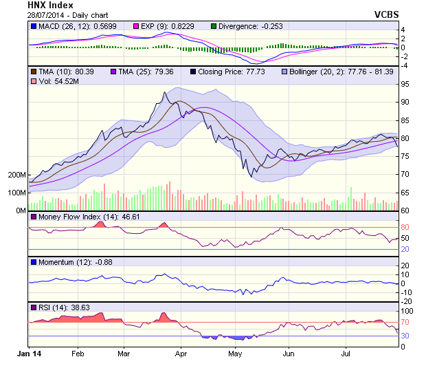 Như vậy, HNX-Index đang bước vào một đợt điều chỉnh nhẹ, phiên ngày 29/7 HNX-Index sẽ kiểm chứng ngưỡng hỗ trợ 77 điểm.