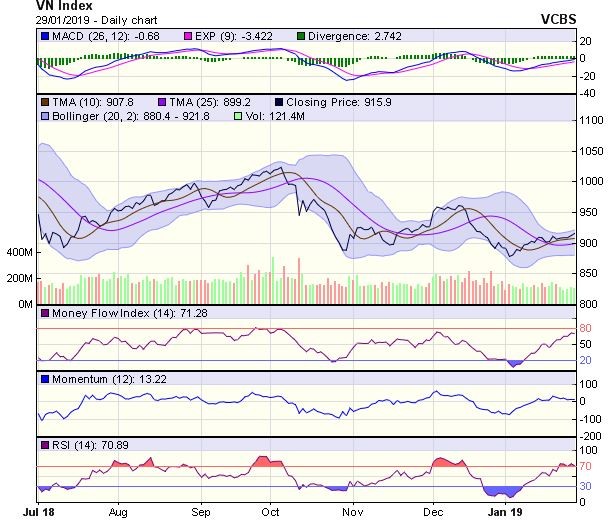 Dự báo, trong phiên giao dịch tiếp theo 30/1, VN-Index có thể sẽ diễn biến giằng co và rung lắc do đã tiếp cận với vùng kháng cự 915-920 điểm (MA50).
