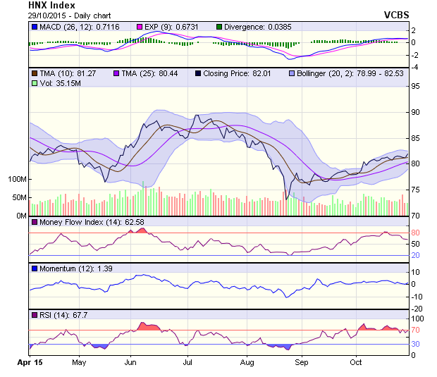 Về mặt kỹ thuật, VN-Index đã chính thức vượt vùng kháng cự 600 điểm sau khi kiểm nghiệm thành công vùng hỗ trợ 590-595 điểm và HNX-Index tiếp tục xu thế tăng điểm sau khi kiểm nghiệm thành công vùng hỗ trợ 81 điểm. Việc các chỉ số có sự bứt phá trong phiên 29/10 với thanh khoản duy trì ở mức khá là tín hiệu tích cực cho thấy xu thế tăng của thị trường vẫn được duy trì. Nhà đầu tư nắm giữ danh mục với tỷ trọng cổ phiếu cao để tận dụng xu hướng tăng của thị trường.