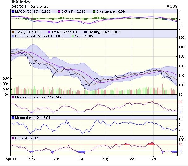 HNX-Index có diễn biến tương tự. Mặc dù, chỉ số có phiên tăng điểm trở lại nhưng vẫn đang đóng cửa dưới MA5 và 20, cho thấy xu hướng giảm vẫn đang tiếp diễn, phiên tăng điểm vừa qua có thể chỉ mang tính kỹ thuật.