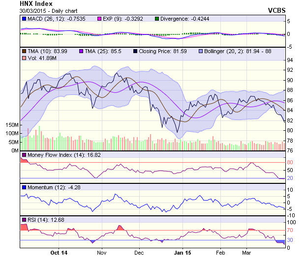 Đồ thị chỉ số HNX-Index tiếp tục tạo thành 1 Black Candlestic dài rơi sâu xuống dưới ngưỡng hỗ trợ 82 điểm. Điều này cho thấy áp lực bán đang tiếp tục diễn ra mạnh và khả năng chỉ số này sẽ test lại mốc hỗ trợ 80 điểm. Các chỉ báo kỹ thuật cũng không có tín hiệu khả quan khi đường stochastic rơi sâu xuống dưới ngưỡng 20 trong khi đường RSI đã chạm mốc 30 và đang tiếp tục xu hướng giảm mạnh.
