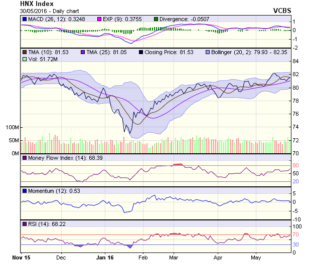 HNX-Index hình thành 1 cây nến xanh với thân nến nhỏ và tương đương bóng nến trên, dưới. Giao dịch giẳng co tiếp tục diễn ra. Về ngắn hạn, chỉ số đang nằm trên đường middle bollinger và MA20. Xu hướng của dải bollinger đang co hẹp lại, cho tín hiệu mở rộng trong ngắn hạn. RSI đang quay trở lại tiệm cận đường 70. Ngưỡng kháng cự 82 điểm. Ngưỡng hỗ trợ 80,5-81 điểm.