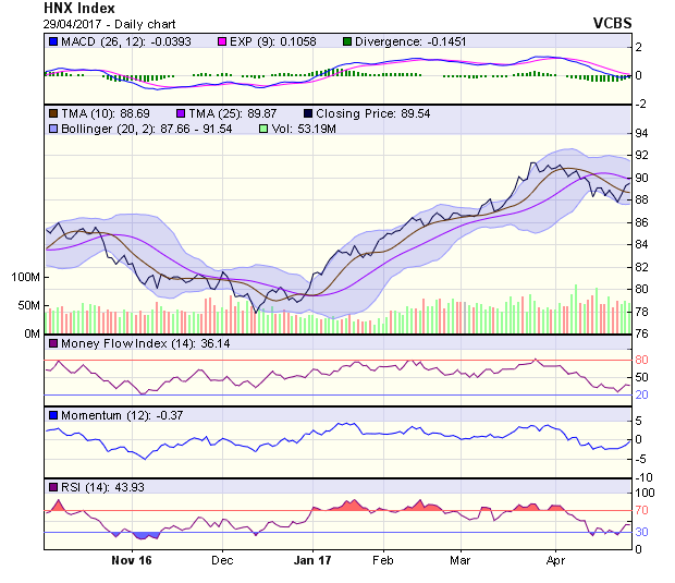 Về xu hướng dài hạn, HNX-Index tiếp tục vận động trong thị trường giá lên (bull market) với hỗ trợ tại 84,3 điểm (MA50). Dự báo trong tuần giao dịch này, xu hướng tăng điểm của HNX-Index sẽ gặp khó khăn khi đã tiệm cận mức kháng cự 89,8 điểm (MA5), chỉ số cần vượt qua ngưỡng này để xác nhận xu hướng tăng tiếp, hỗ trợ gần nhất tại 89 điểm (MA10) và xa hơn tại 87,5 điểm (đáy phiên 25/4).