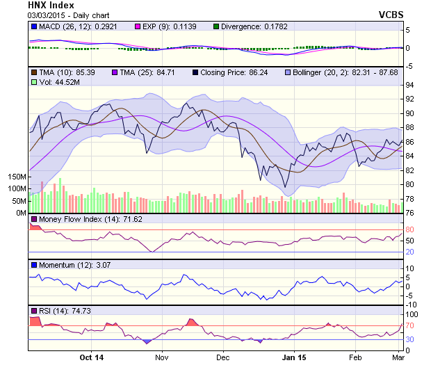 Đồ thị chỉ số HNX-Index tạo thành 1 Marubozu cho thấy đà tăng mạnh mẽ đang diễn ra, tuy nhiên cần có phiên bật khỏi dường SMA100 để khẳng định xu hướng tăng điểm trong ngắn hạn quay trở lại. Các chỉ báo kỹ thuật đều cho tín hiệu hồi phục mạnh khi RSI đang tiến tới vùng 70 trong khi MACD cũng duy trì đà tăng trên mốc 0.
