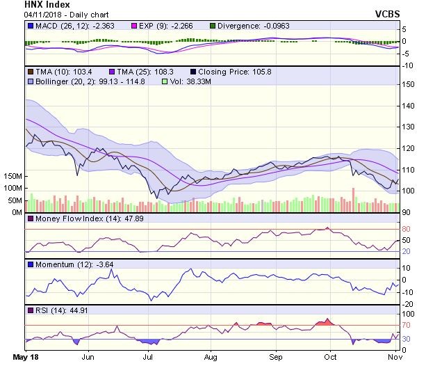 HNX-Index có diễn biến tương tự. Mặc dù, chỉ số có phiên tăng điểm trở lại nhưng vẫn duy trì đóng cửa dưới MA 20, cho thấy xu hướng chính trong ngắn hạn có thể vẫn là điều chỉnh, phiên tăng điểm vừa có thể chỉ mang tính kỹ thuật, ngưỡng kháng cự gần có thể là vùng 107 điểm (MA20 và đáy cũ tháng 10/2018).