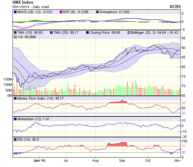 Đóng cửa tại 88,68 điểm với mức giảm chỉ 0,03 điểm so với phiên trước, HNX-Index tiếp tục có một phiên giao dịch giằng co trong biên độ hẹp. Áp lực bán vẫn hiện hữu khiến chỉ số có thời điểm giảm ~ 1 điểm, tuy nhiên lực mua bắt đáy khá tích cực giúp chỉ số không giảm quá sâu. Dải Bollinger Band thu hẹp trở lại, kết hợp cùng SO bắt đầu cắt xuống đường tín hiệu, cùng nhóm các chỉ báo sức mạnh cũng yếu dần. Theo đó, thị trường đang thiếu đi những yếu tố hỗ trợ thì HNX-Index sẽ chưa thể thiết lập đà tăng trở lại.