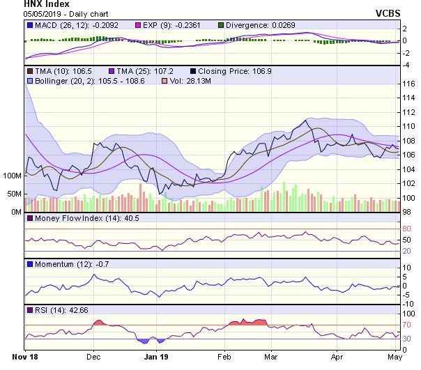 HNX-Index có một diễn biến tương tự. Chỉ số có phiên giảm điểm thứ hai liên tiếp và duy trì đóng cửa dưới MA20, cho thấy áp lực điều chỉnh ngắn hạn đang mạnh dần lên. Ngưỡng hỗ trợ gần có thể là vùng 105,8 điểm (MA100).