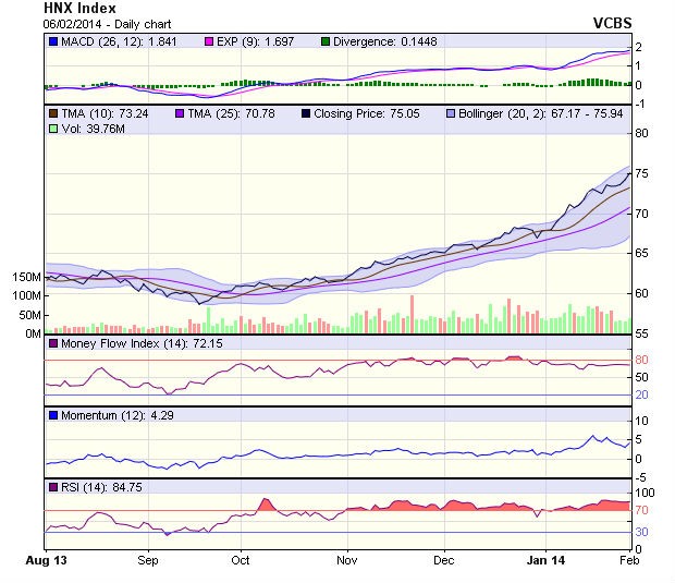 Bứt lên ngưỡng 75,05 điểm sau phiên giao dịch ngày 06/02, HNX-Index đã đạt mức cao nhất tính cho khoảng thời gian dài trở lại đây.