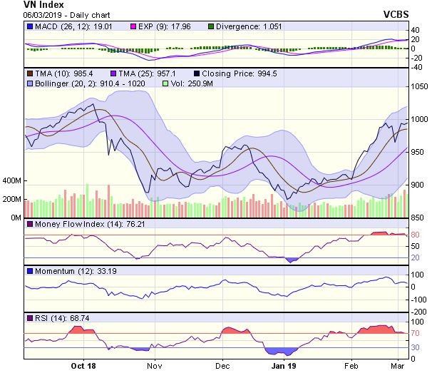 Tuy nhiên, dù chưa phát ra tín hiệu bán nhưng chỉ báo MACD đã chuyển sang đi ngang kể từ phiên sụt giảm mạnh ngày 28/02/2019, kết hợp với việc chỉ báo MACD-histogram đang có dấu hiệu giảm dần, là một tín hiệu rõ ràng hơn cảnh báo về rủi ro thị trường có thể điều chỉnh trong những phiên tới.