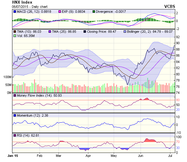 Đồ thị chỉ số HNX-Index cũng tạo thành mô hình Three white soldiers và đang test lại mốc đỉnh cũ trong giai đoạn giữa tháng Sáu vừa qua. Đà tăng đang duy trì mạnh mẽ và chỉ số này có khả năng test lại mốc đỉnh cũ 91 điểm trong các phiên tới. Các chỉ báo kỹ thuật cho xu hướng tăng mạnh mẽ đang diễn ra. Đường tín hiệu đã cắt lên trên đường MACD trong khi đường RSI cũng đang tăng mạnh và tiệm cận vùng quá mua.