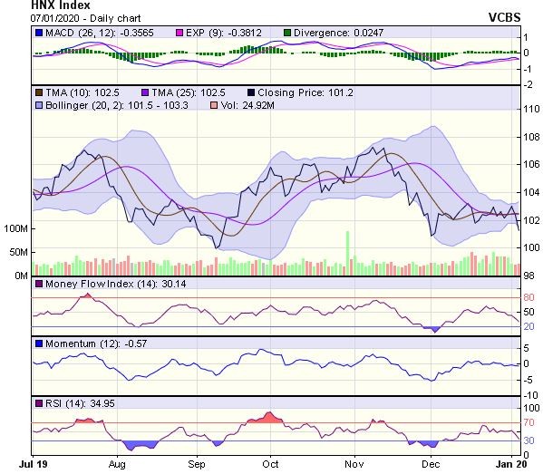 HNX-Index có diễn biến tương tự. Chỉ số cũng có phiên tăng điểm trở lại khi tiệm cận vùng hỗ trợ quanh đáy cũ tháng 12/2019. Đồng thời, chùm MA5,10,20 đang hội tụ và khá phẳng, cho thấy xu hướng ngắn hạn của chỉ số có thể là Sideway, với vùng vận động quanh 100,5-103,5 điểm.