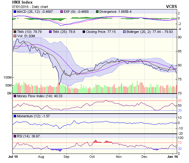 HNX-Index giảm mạnh, tạo thành nến đỏ dài phá vỡ ngưỡng hỗ trợ 77.5 điểm. Xung lực giảm điểm của HNX-Index trong phiên 7/1 đã mạnh lên rất nhiều, nhiều khả năng chỉ số này sẽ test lại mốc hỗ trợ 75.8 điểm trong ngắn hạn. Các chỉ báo kỹ thuật cũng đang hỗ trợ cho xu hướng giảm của HNX-Index.