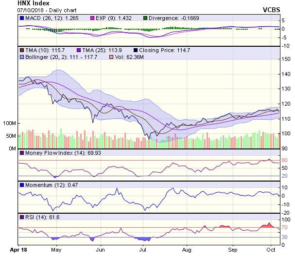 HNX-Index có diễn biến tương tự. Mặc dù, chỉ số có phiên giảm điểm trở lại nhưng vẫn duy trì đóng cửa trên MA20, cho thấy xu hướng chính có thể vẫn là phục hồi, phiên giảm điểm có thể chỉ mang tính kỹ thuật, ngưỡng hỗ trợ hiện tại có thể là vùng 113,6 điểm.