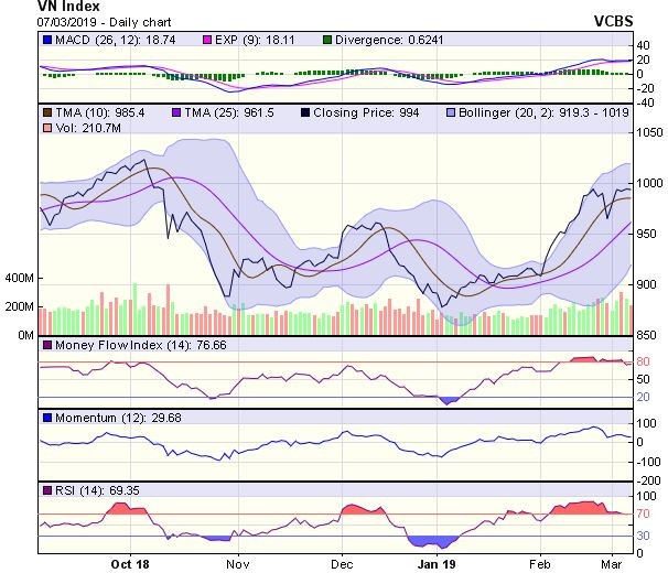 Do đó, chúng tôi cho rằng, trong trường hợp kém tích cực, chỉ số có thể sẽ cần thêm một nhịp điều chỉnh kỹ thuật kéo dài 3-5 phiên, nhằm rũ bỏ và củng cố lại cho xu hướng chính bền vững hơn. Ngưỡng hỗ trợ gần có thể là vùng 965-970 điểm (đỉnh cũ tháng 12/2018 và MA20).