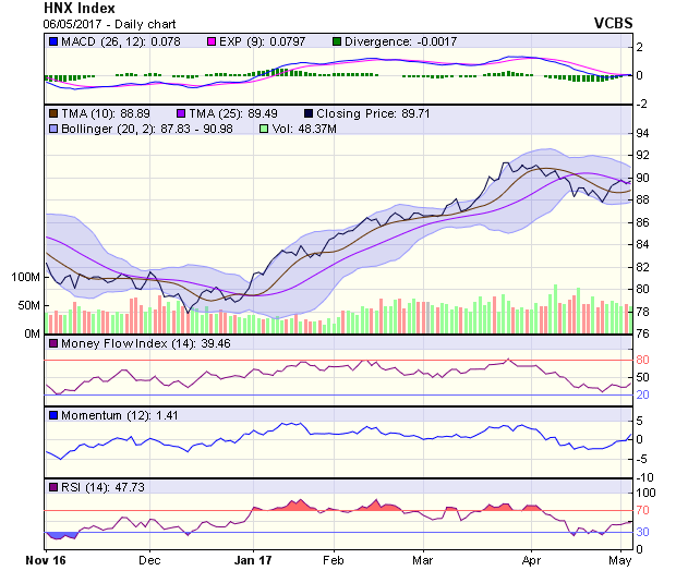 Về xu hướng dài hạn, HNX-Index đang vận động trong thị trường giá lên (bull market), với hỗ trợ tại 84,5 điểm (MA50). Dự báo tuần giao này, HNX-Index nhiều khả năng tiếp tục đà hồi phục để hướng đến vùng đỉnh trung hạn tại 92 điểm, vùng hỗ trợ của chỉ số được xác định trong khoảng 89,3-89,6 điểm.