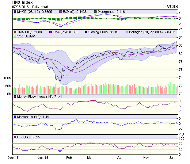 HNX-Index hình thành cây nến xanh đặc, không có bóng nến với thanh khoản tăng so với phiên giảm 6/6, vượt mốc kháng cự 83 điểm. MACD tiếp tục cho tín hiệu đi lên trên đường 0. RSI cho tín hiệu quay lại đường 70. Vùng kháng cự 83,5 điểm. Vùng hỗ trợ 82,5 điểm.