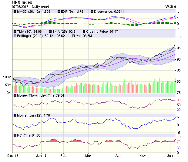 HNX-Index tăng điểm phiên thứ 6 liên tiếp với mức tăng là rất mạnh. Tín hiệu kỹ thuật ngắn hạn duy trì tích cực, với vùng hỗ trợ trong khoảng 94,5-95,3 điểm (MA5-10) và kháng cự gần nhất là ngưỡng tâm lý 98 điểm. Dự báo phiên 8/6, HNX-Index nhiều khả năng tiếp tục tăng điểm về kháng cự gần nhất tại 98 điểm, vùng hỗ trợ của chỉ số được xác định tại 94,5-95,3 điểm.