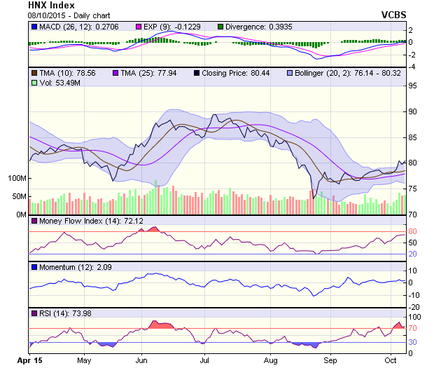 HNX-Index cũng có phiên hồi phục tích cực trở lại, tăng lên trên mốc 80 điểm với lượng giao dịch duy trì trên mốc 50 triệu đơn vị. Mẫu hình piercing line xuất hiện sau khi hiện tượng pull back xuất hiện trong phiên 7/10. Xung lực tăng điểm do vậy vẫn đang khá mạnh. Tuy vậy, các chỉ báo như Stochastic hay RSI đang dao động trong vùng Overbought, do vậy nhà đầu tư nên thận trọng nếu tiến hành mua đuổi tại vùng giá này.