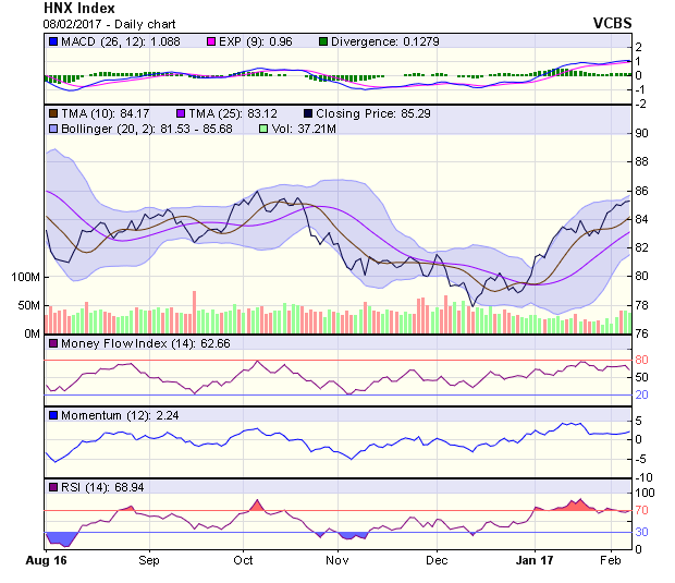 HNX-Index tăng điểm nhẹ phiên thứ 2 liên tiếp. Tín hiệu kỹ thuật trong ngắn hạn tiếp tục tích cực, với vùng hỗ trợ trong khoảng 84,2-85 điểm (MA5-10) và kháng cự gần nhất tại 85,9 điểm (đỉnh phiên 7/2). Tín hiệu kỹ thuật trung hạn ở mức tích cực, với hỗ trợ gần nhất tại 83,6 điểm (MA20).