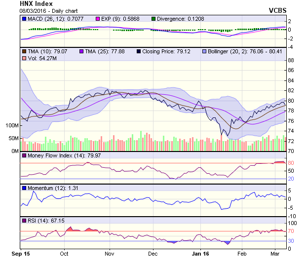 HNX-Index điều chỉnh giảm trước áp lực bán từ nhiều nhà đầu tư ngắn hạn. Một số chỉ báo như RSI, Stochastic Oscillators cũng có xu hướng điều chỉnh nhẹ khi rơi khỏi vùng overbought. Tuy nhiên, nếu như vùng 78-79 điểm tiếp tục được giữ vững, HNX-Index sẽ nhanh chóng tăng điểm trở lại và tiếp tục xu hướng tích cực trong ngắn hạn.