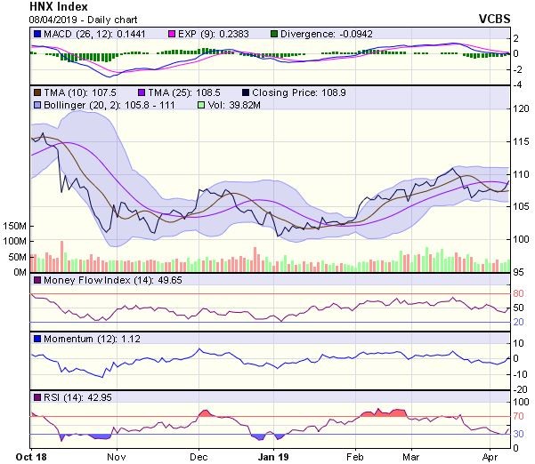 HNX-Index có diễn biến tương tự. Chỉ số cũng đang cho tín hiệu quay lại xu hướng phục hồi, khi chỉ số đang đi lên đóng cửa trên MA20, kèm theo khối lượng giao dịch gia tăng, cho thấy chỉ số có thể có cơ hội đi lên thử thách vùng 111,2 điểm.