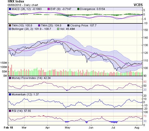 Đối với sàn Hà Nội, HNX-Index có diễn biến tương tự. Chỉ số tiếp tục có phiên tăng điểm thứ hai liên tiếp và duy trì đóng cửa trên MA20, kèm khối lượng giao dịch gia tăng cho thấy xu hướng phục hồi đang được duy trì, ngưỡng kháng cự tiếp theo có thể là vùng 108.3 điểm (MA50).
