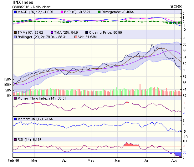 HNX-Index hình thành cây nến đỏ hammer. Thanh khoản sụt giảm tương đối mạnh so với các phiên gần đây. Hnx-Index hiện đang nằm trên đường MA200, hỗ trợ mạnh. RSI và MACD đều đang cho tín hiệu tiêu cực. Vùng hỗ trợ 80 điểm. Vùng kháng cự 82 điểm.