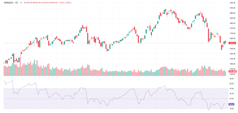 VN-Index kết thúc phiên giao dịch với nến đỏ, cho thấy phe bán đang trở lại chiếm ưu thế sau khi thị trường đã ghi nhận hai phiên hồi phục từ vùng đáy ngắn hạn 1.600 điểm.