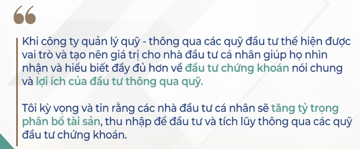 Hai là tạo được nguồn vốn dồi dào, bền vững cho các doanh nghiệp và nền kinh tế. Khi nhà đầu tư cá nhân tin tưởng và chuyển sang đầu tư vào quỹ thay vì tự giao dịch, tôi tin rằng các nhà đầu tư cá nhân sẽ có xu hướng phân bổ thêm tài sản và thu nhập của mình vào TTCK, thay vì đầu tư một cách cầm chừng hoặc mang tính thử nghiệm, thăm dò, như thường được gọi là “chơi chứng khoán”.