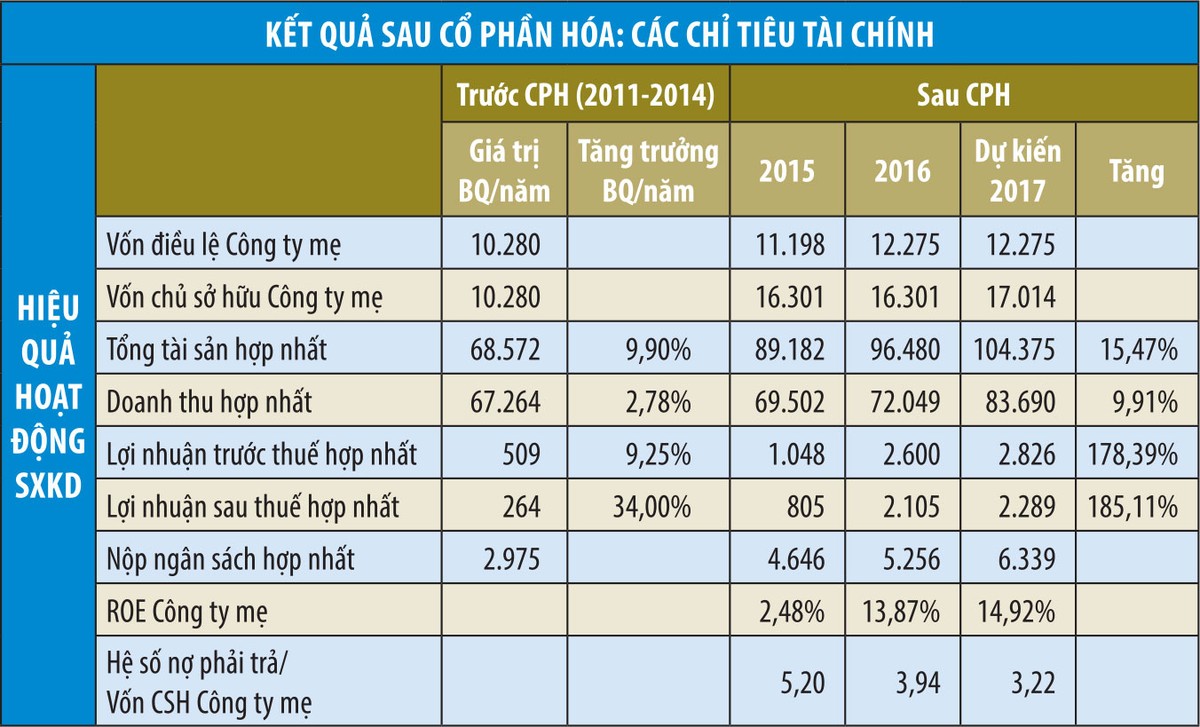 Lãnh đạo Vietnam Airlines cho biết, năm 2017, lợi nhuận sau thuế hợp nhất của Tổng công ty dự kiến sẽ đạt 2.289 tỷ đồng, giúp DN đạt mức tăng trưởng lợi nhuận bình quân/năm tính từ sau khi hoàn tất cổ phần hóa (năm 2015) lên tới 185,11% (xem bảng).