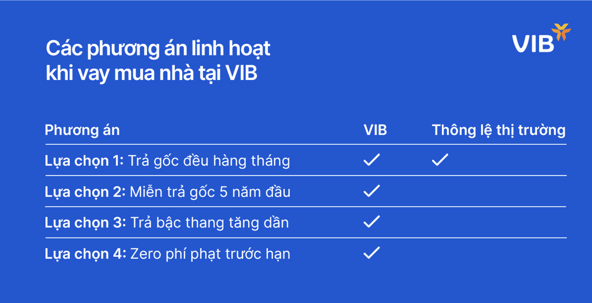 Một trong những ưu điểm nổi bật khác của các gói vay mua nhà tại VIB chính là sự linh hoạt trong phương án trả nợ. Mỗi người vay đều có những tình huống tài chính khác nhau và rất khó để có một giải pháp chung cho tất cả mọi người. Điểm khác biệt khi vay tại VIB là khách hàng có đến 4 tùy chọn phương án trả nợ, linh hoạt theo khả năng tài chính và nhu cầu cá nhân của từng người.