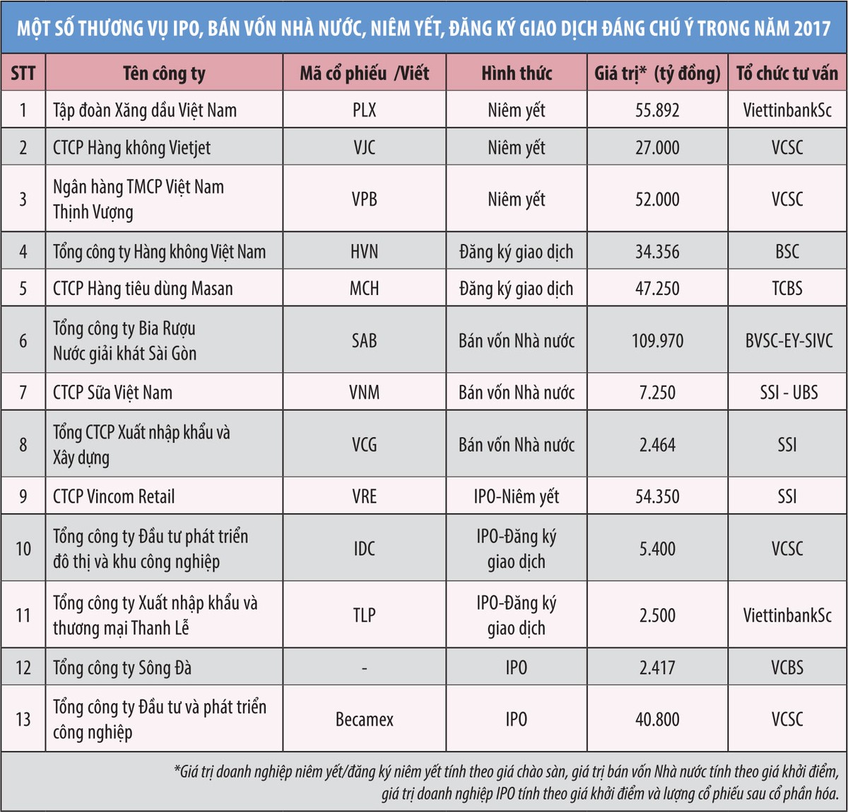 Thị trường chứng khoán tăng trưởng mạnh trong năm 2017, cùng định hướng đẩy mạnh cổ phần hóa, lên sàn chứng khoán, thoái vốn nhà nước khiến các thương vụ tăng mạnh cả về số lượng và giá trị. Nhắc đến thành công của những đợt IPO, niêm yết, chào bán không thể không nhắc đến các công ty chứng khoán trong vai trò là nhà tư vấn cho doanh nghiệp.