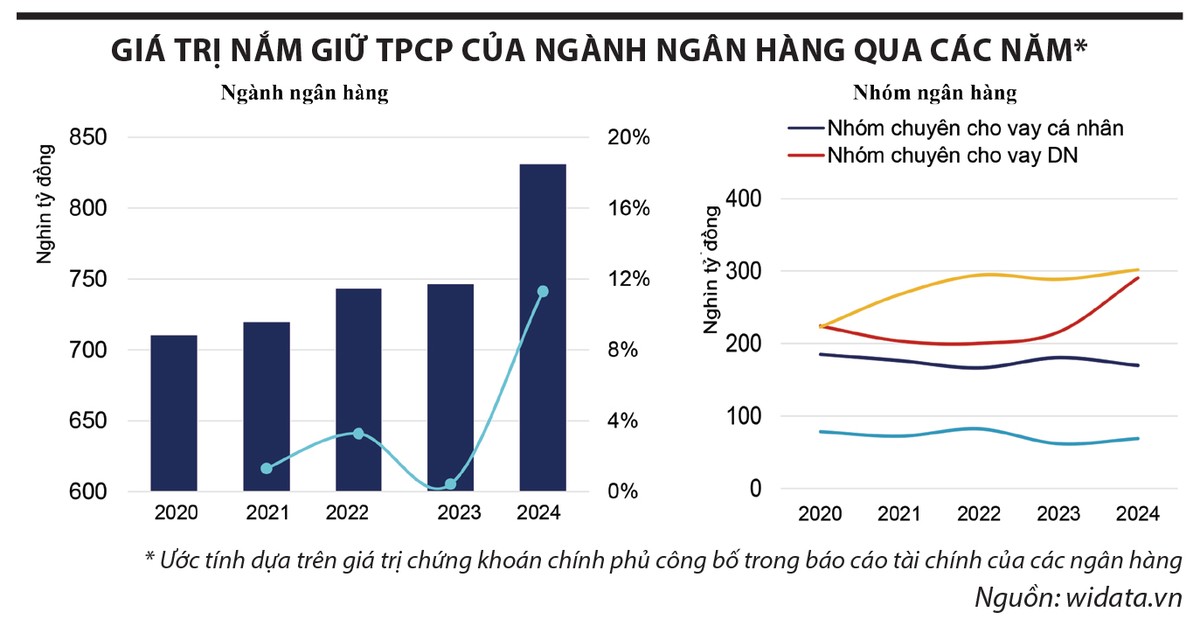 Tổng quy mô TPCP mà các ngân hàng thương mại nắm giữ đạt gần 831.000 tỷ đồng, tăng trưởng 11,3% - tiệm cận với mức tăng trưởng giá trị phát hành TPCP mới trong năm 2024. Trong danh mục trái phiếu của ngành ngân hàng, khoảng 2/3 giá trị TPCP thuộc nhóm chứng khoán sẵn sàng để bán, 1/3 thuộc nhóm đầu tư giữ đến ngày đáo hạn, trong khi tỷ trọng chứng khoán kinh doanh chỉ chiếm một phần rất nhỏ, chỉ khoảng 1% tổng giá trị danh mục.