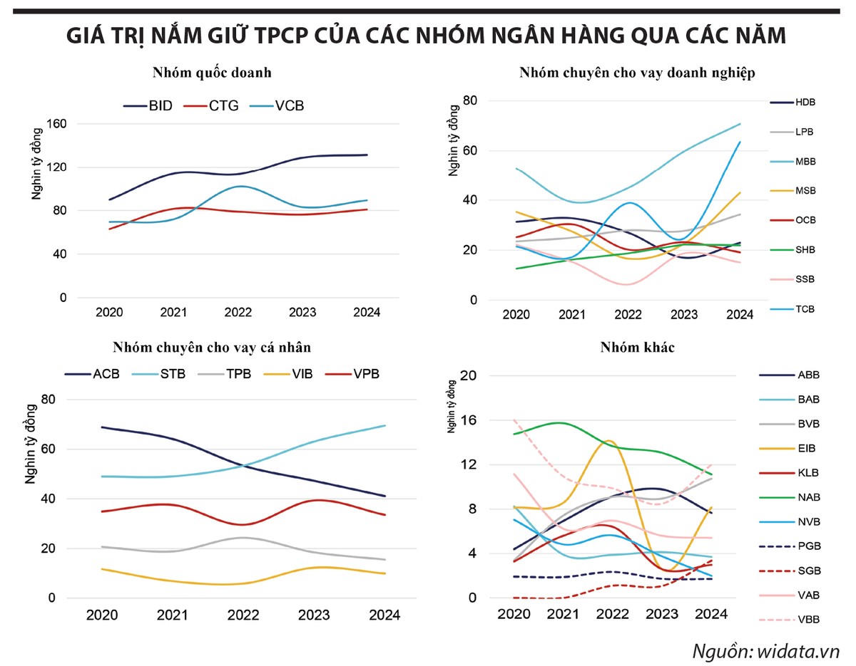 Nhóm ngân hàng chuyên cho vay doanh nghiệp có mức gia tăng đầu tư TPCP trong năm 2024, với mức tăng trưởng hơn 40%, trong khi các nhóm ngân hàng khác đều duy trì ở mức không đổi. Xét về mức tương đối thì tỷ trọng phần trăm nắm giữ TPCP của nhóm các ngân hàng sụt giảm đáng kể trong những năm qua. Điều này có thể được giải thích bởi xu hướng lãi suất duy trì ở mức thấp trong hai năm qua.